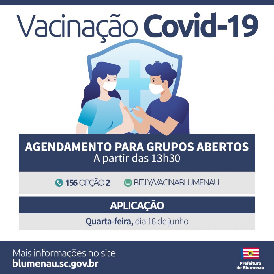 Entre os contemplados estão pessoas com 53 anos ou mais, além dos grupos prioritários, como, por exemplo, pessoas com comorbidades ou deficiências permanentes, profissionais da educação e das forças de segurança e salvamento. O agendamento deve ser feito no site da Prefeitura de Blumenau, pelo link bit.ly/VacinaBlumenau ou pelo Alô Saúde, no telefone 156 (opção 2), que terá atendimento até às 22h.