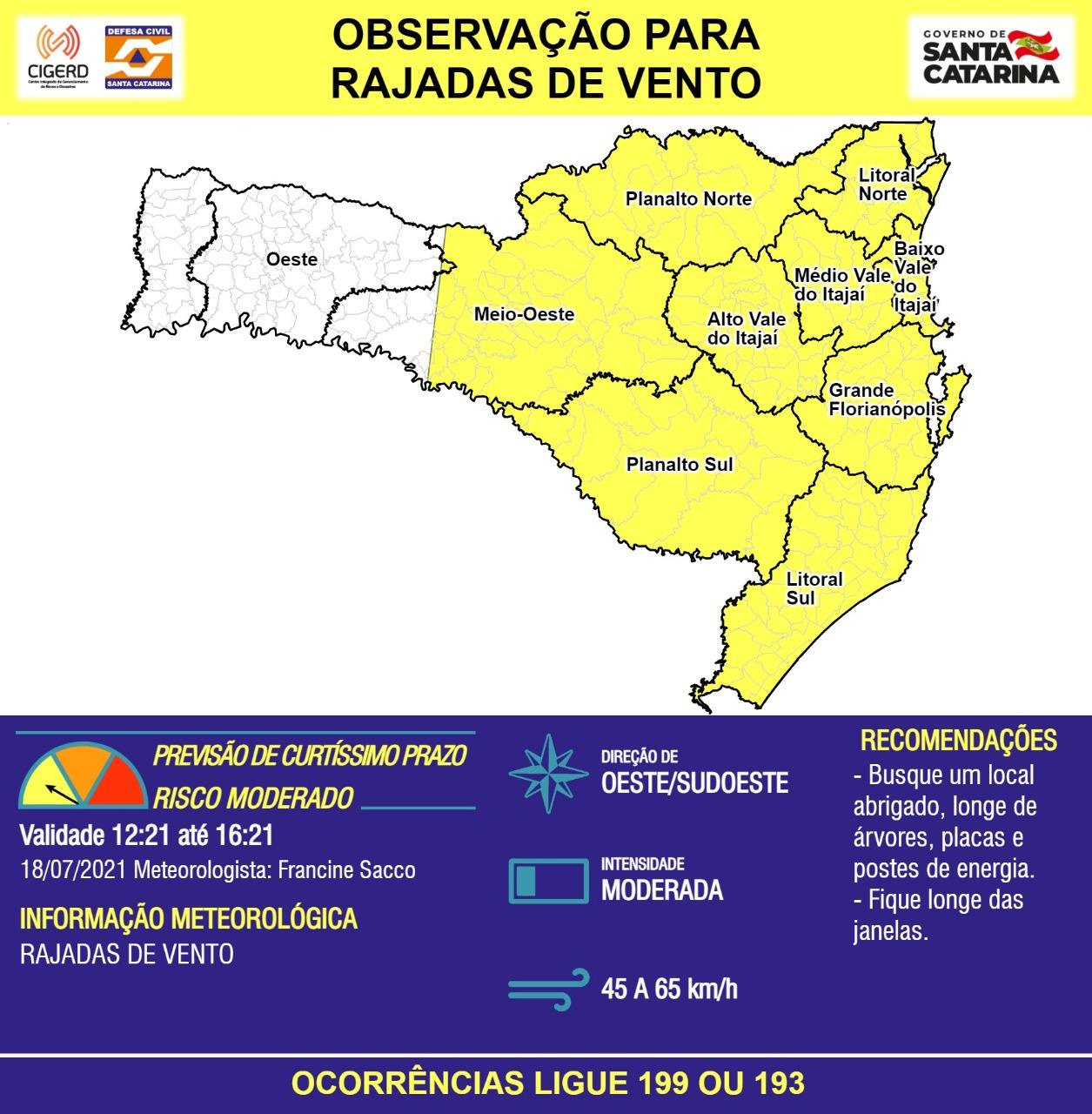 OBSERVAÇÃO - 18/07 12:21 - RAJADAS DE VENTO de quadrante oeste/sudoeste, com intensidade MODERADA (45 a 65 km/h), para as regiões do Oeste, Meio-Oeste, Planalto Norte, Litoral Norte, Planalto Sul, Litoral Sul, Grande Florianópolis, Baixo, Médio e Alto Vale do Itajaí nas próximas 4 horas. Ocorrências ligue 199 ou 193.