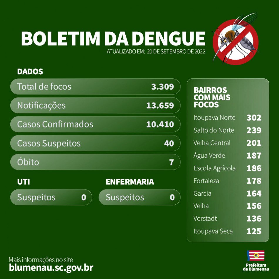 Ainda na terça-feira (20), nenhum morador de Blumenau está internado em hospitais da cidade com suspeita de Dengue. Até agora, Blumenau totaliza 7 óbitos por Dengue no município.