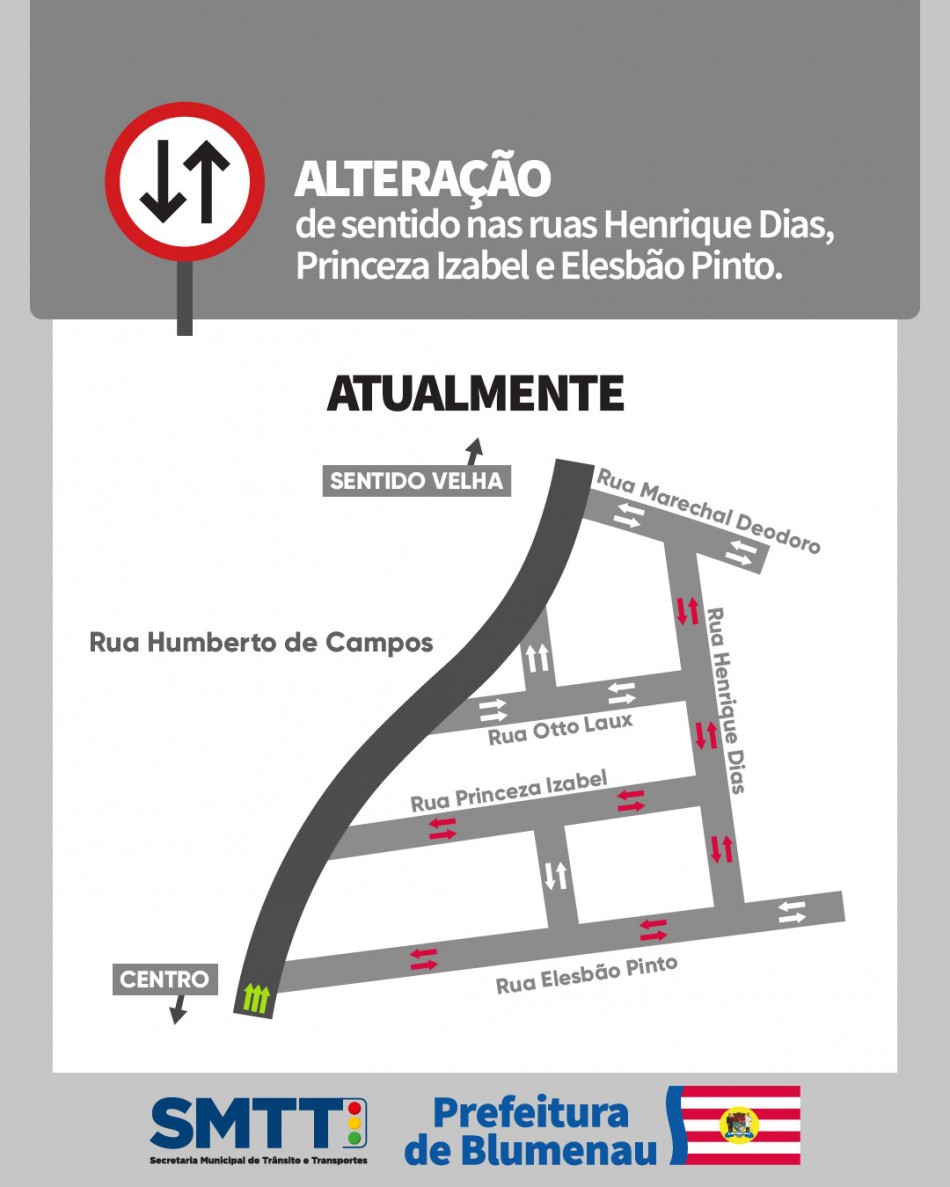 A Prefeitura de Blumenau, por meio da Secretaria de Planejamento Urbano (Seplan), vai alterar o sentido de algumas ruas adjacentes entre a Humberto de Campos e a Marechal Deodoro. O objetivo é melhorar o fluxo de veículos, amenizado pontos de conflitos em alguns cruzamentos.