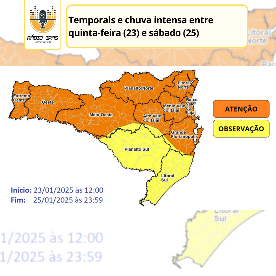 Nesta quinta-feira (23), as condições para temporais retornam em toda Santa Catarina. As chuvas começam a partir da tarde no Grande Oeste, acompanhadas de raios e ventos fortes. Além disso, nessa região os acumulados podem causar alagamentos e enxurradas pontuais. No decorrer da tarde e noite, as chuvas avançam principalmente para o Planalto Norte e regiões litorâneas, aumentando o risco de transtornos nessas áreas.